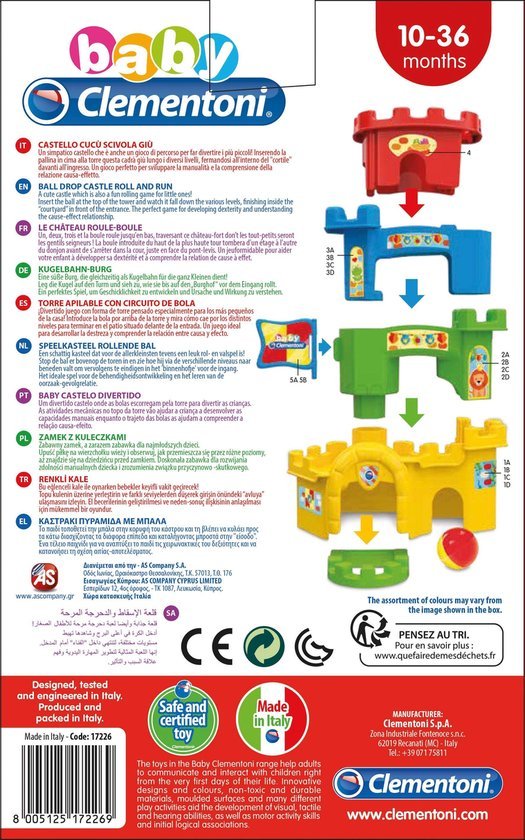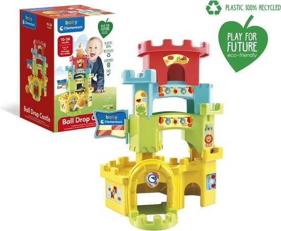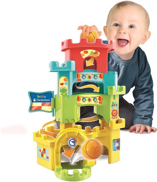 Het Baby Clementoni Speelkasteel is educatief babyspeelgoed waarmee jonge kinderen spelenderwijs leren. Door de bal bovenin de toren te plaatsen, zien zij hoe deze via vier verschillende niveaus naar beneden rolt en eindigt in het binnenhof. Dit helpt bij het begrijpen van oorzaak en gevolg en stimuleert de fijne motoriek.