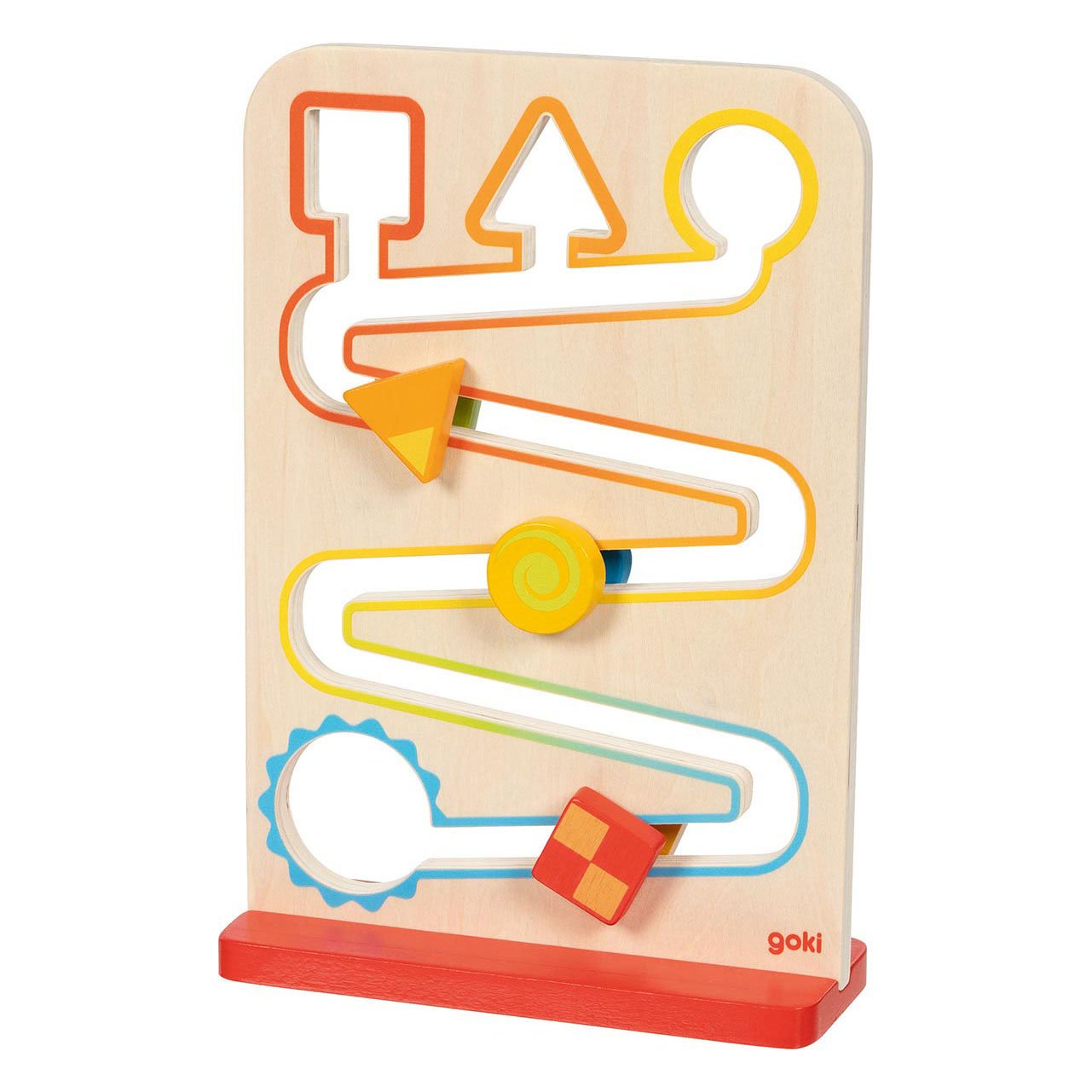 In deze zigzagfiguur kan je 3 verschillende vormen door de baan omhoog leiden. Bovenin kies je welke vorm in welk gat hoort. Laat je de vormen los, dan rollen ze de baan weer af naar beneden.