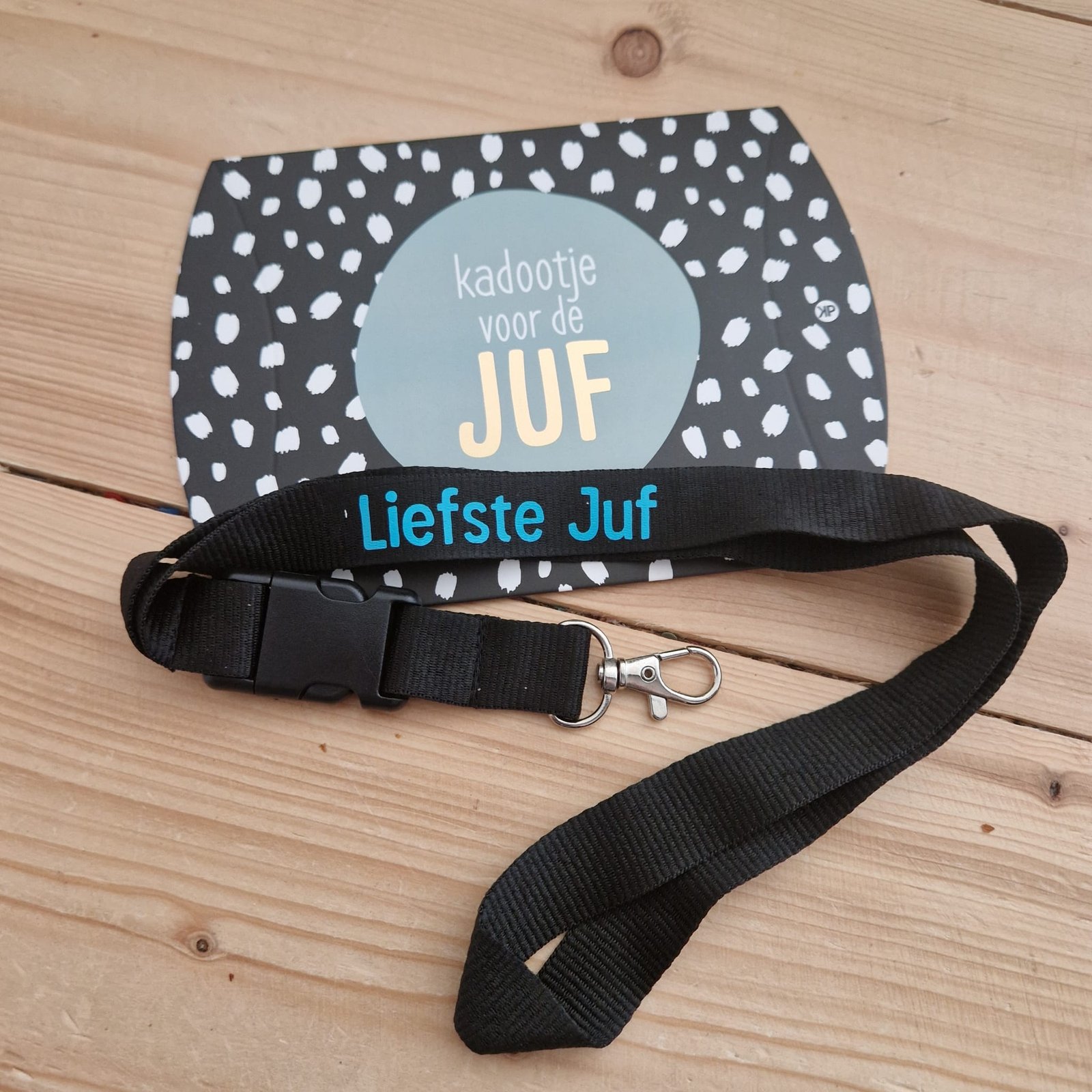 Op de keycord staat de tekst liefste juf in het blauw/groen
