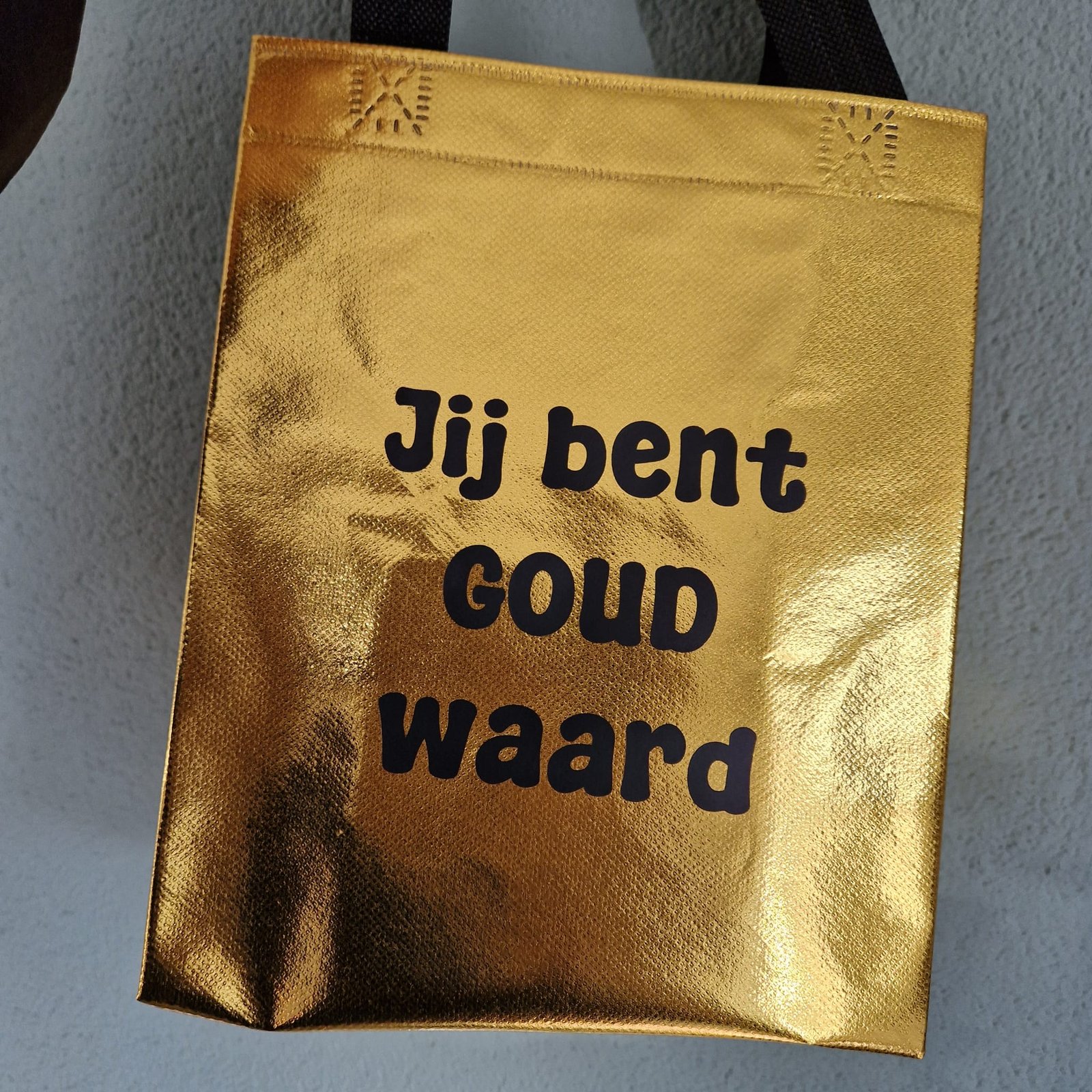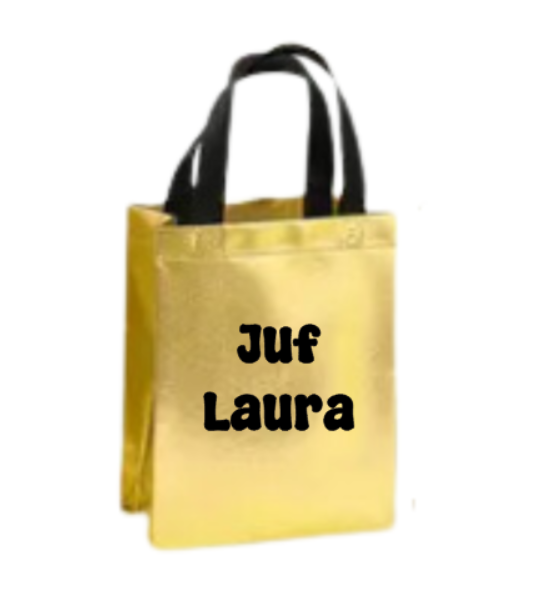 Dit gouden tasje is niet alleen stijlvol, maar ook helemaal persoonlijk te maken! Met een afmeting van 26×20 cm en gemaakt van glanzend aluminiumfilm materiaal, is het de perfecte keuze voor een speciaal cadeau. De tekst wordt erop gezet met een zwarte sticker in het lettertype dat je kunt zien bij de foto’s, wat het tasje een extra unieke en persoonlijke touch geeft. Je kunt kiezen voor een naam, zoals die van de juf, oma of de jarige, of een boodschap zoals “Jij bent goud waard”. Dit tasje is een geweldig cadeau voor elke gelegenheid, van verjaardagen tot bedankjes!