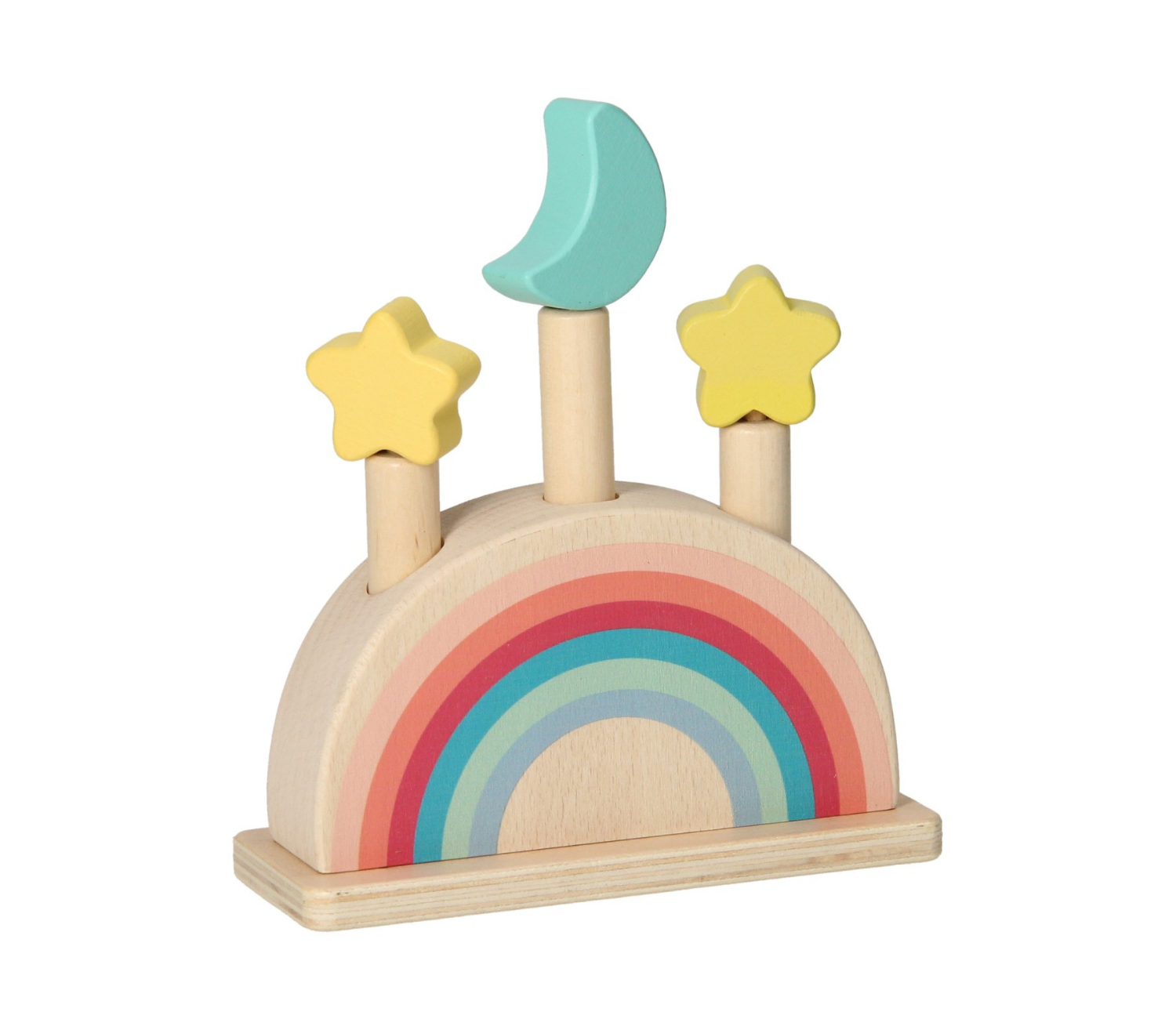 Dit leuke houten pop-up spel is super leuk voor jonge kinderen! Het spel is in de vorm van een regenboog. In de regenboog staan 3 ronde staven met 2 sterren en 1 maan erop. Deze staven kunnen eruit getrokken worden en weer teruggezet worden. Het pop-up spel is volledig van hout gemaakt.
