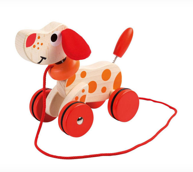 Dit houten kwispel hondje van Joueco is klaar voor avontuur! Ga jij met hem op pad? Trek aan het touw en het hondje rolt al kwispelend achter je aan. Het trekfiguur is gemaakt van duurzaam hout en heeft prachtige oranje en roze details. Het touwtje van het kwispelhondje is ca. 23 cm. Spelen met het hondje ondersteunt de ontwikkeling van fantasie, hand-oog coördinatie en het redenatievermogen.