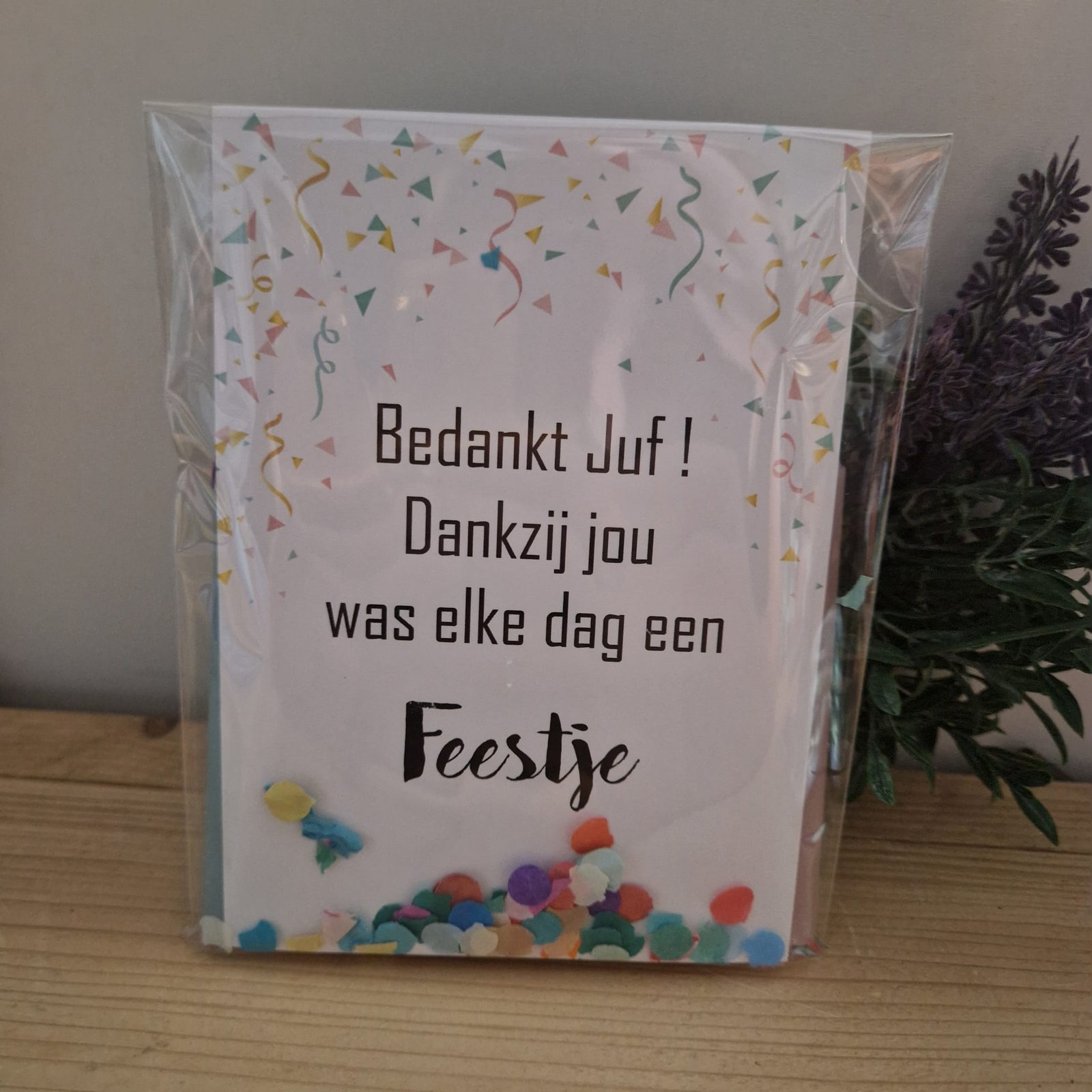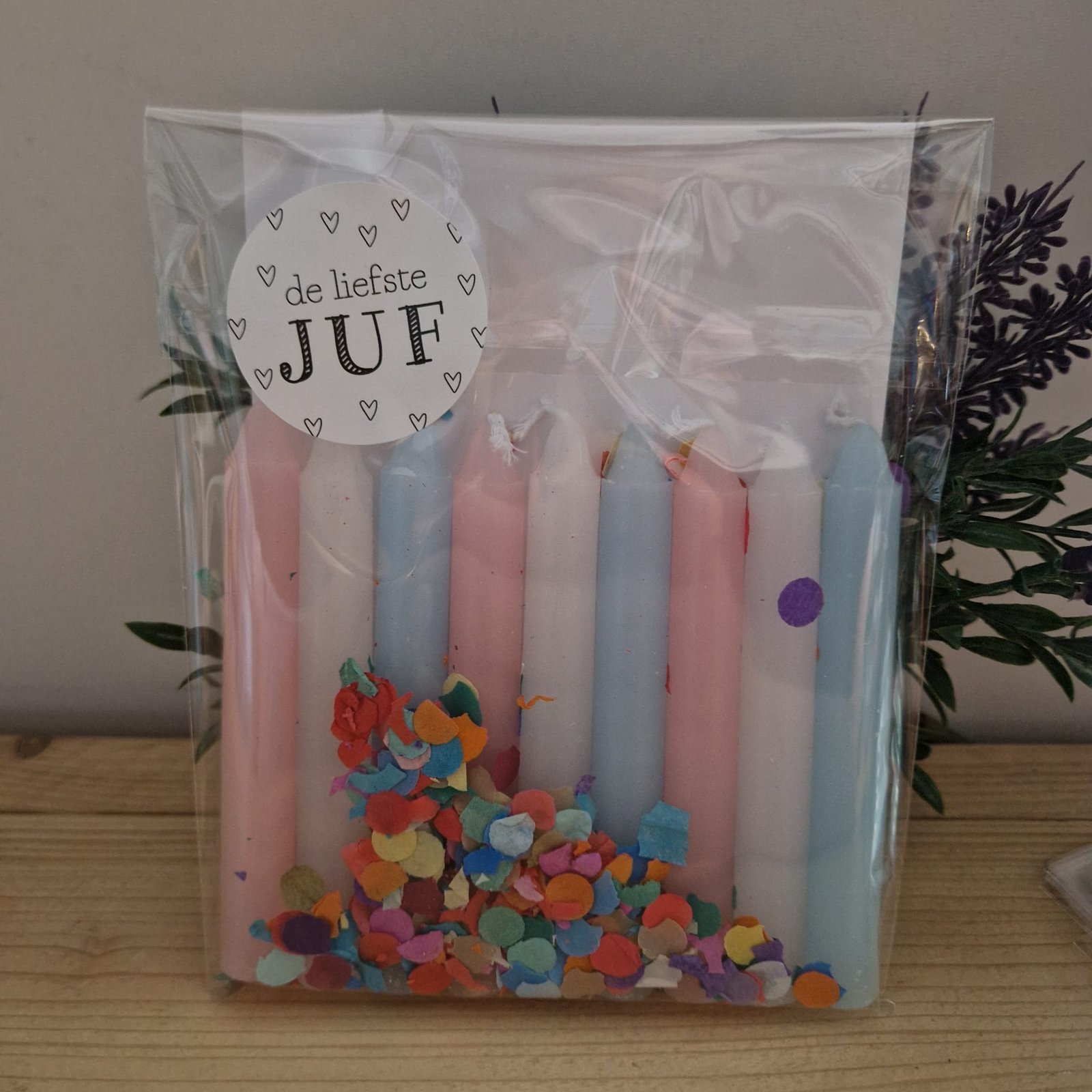 Brievenbus Voor haar, Brievenbuscadeautjes, Juf/Meester9 Kaarsen 3x blauw,3x roze,3x wit samen ingepakt in een doorzichtig zakje met een kaart “Bedankt dankzij jou was elke dag een feestje
