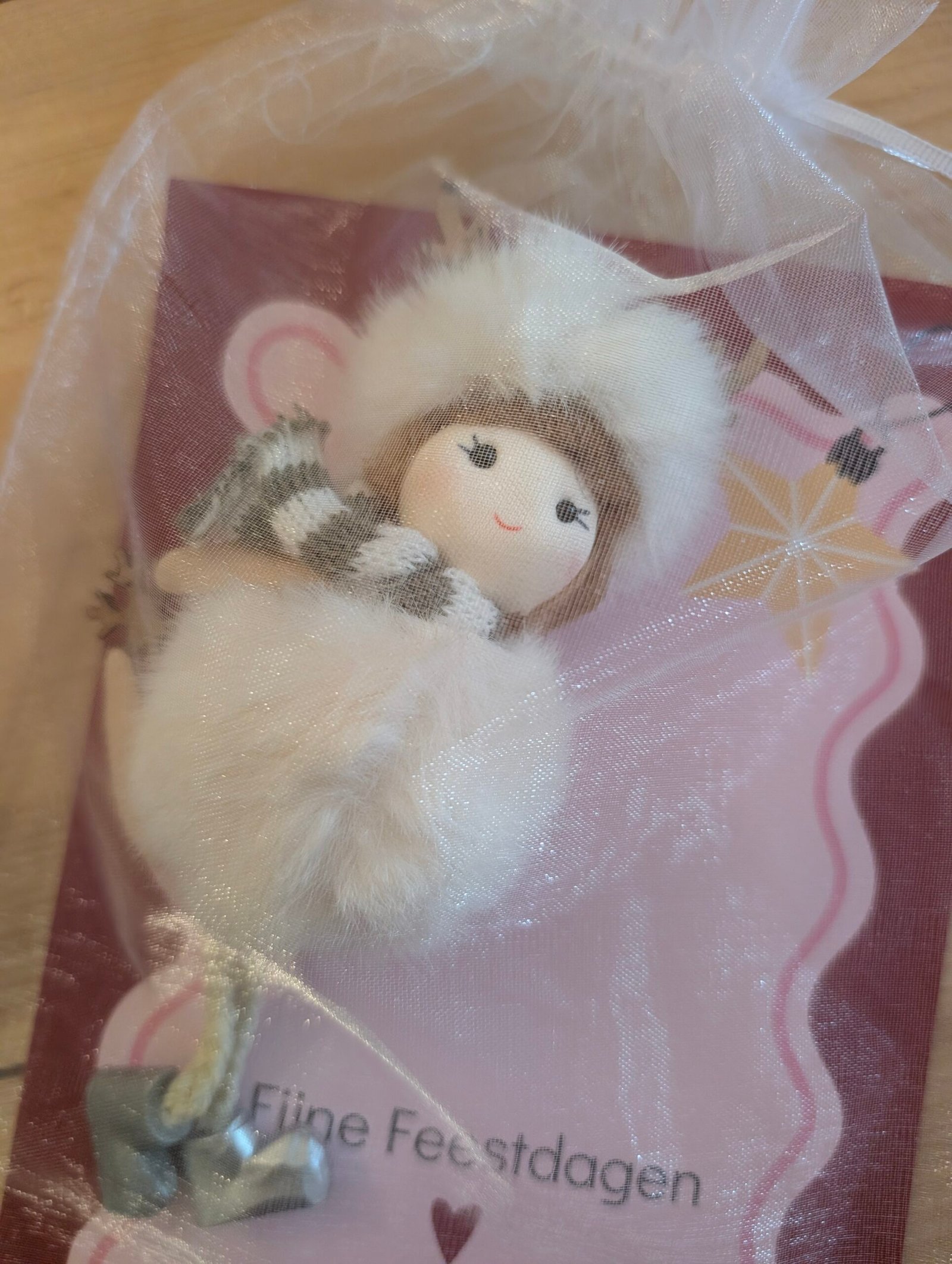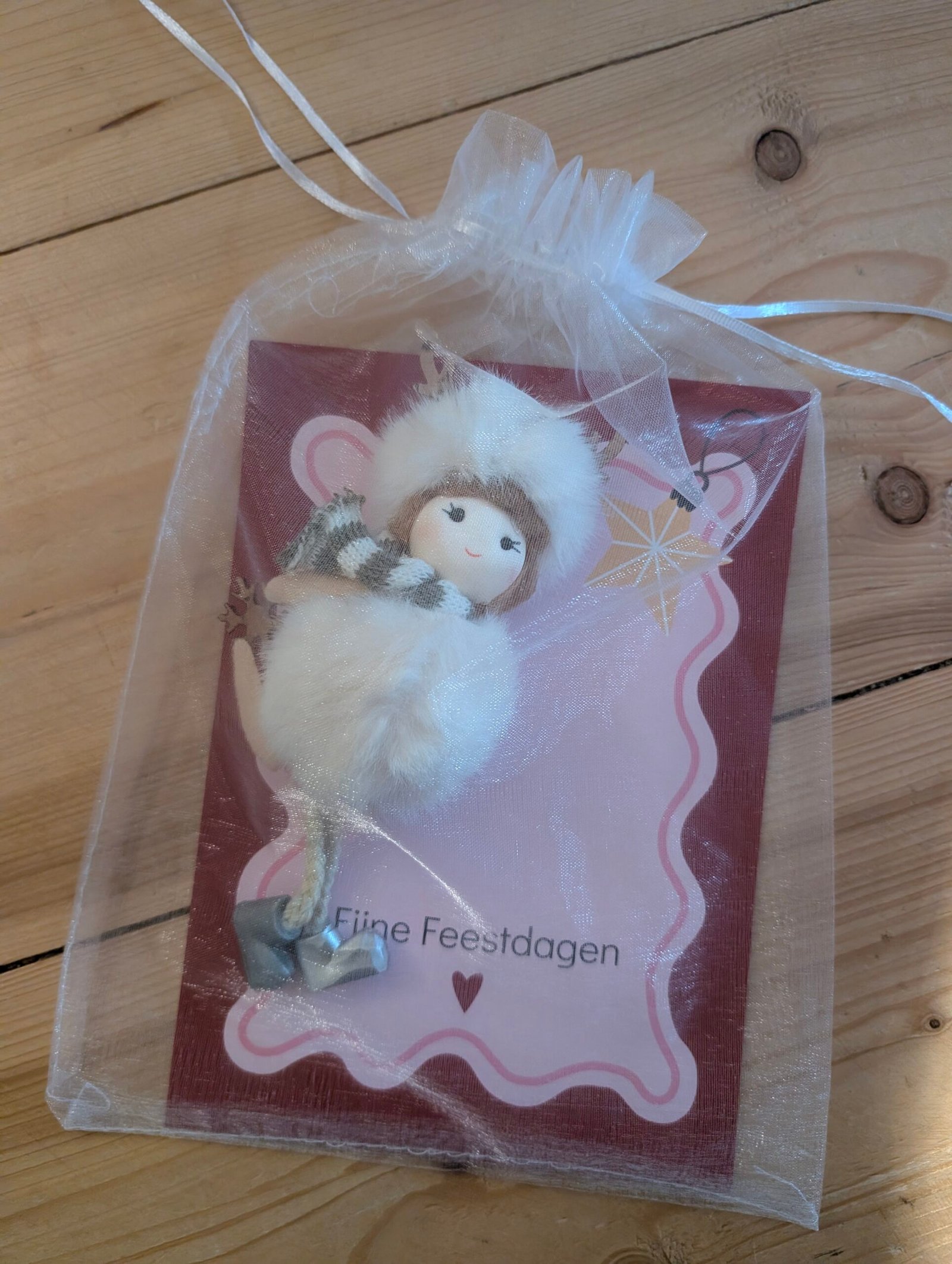 Een warme kerstgroet met een winters knipoog! Deze A5-kaart is voorzien van de tekst Fijne Feestdagen en verpakt in een elegante organza zak (20×30 cm). Binnenin vind je een zachte pluche engeltje in winteroutfit, compleet met sjaal, muts en zilveren schoentjesā klaar om je boom extra sfeer te geven.