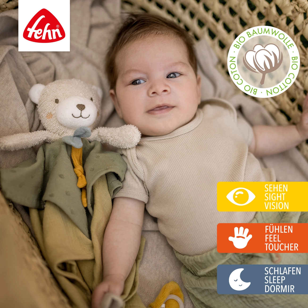 Maak kennis met het Fehn Knuffeldoekje Beer uit de FehnNatur®-collectie: een zacht vriendje, dekentje en fopspeenhouder in één. Ideaal om je baby te troosten bij het inslapen en leuk om overdag mee te voelen, grijpen en knuffelen.