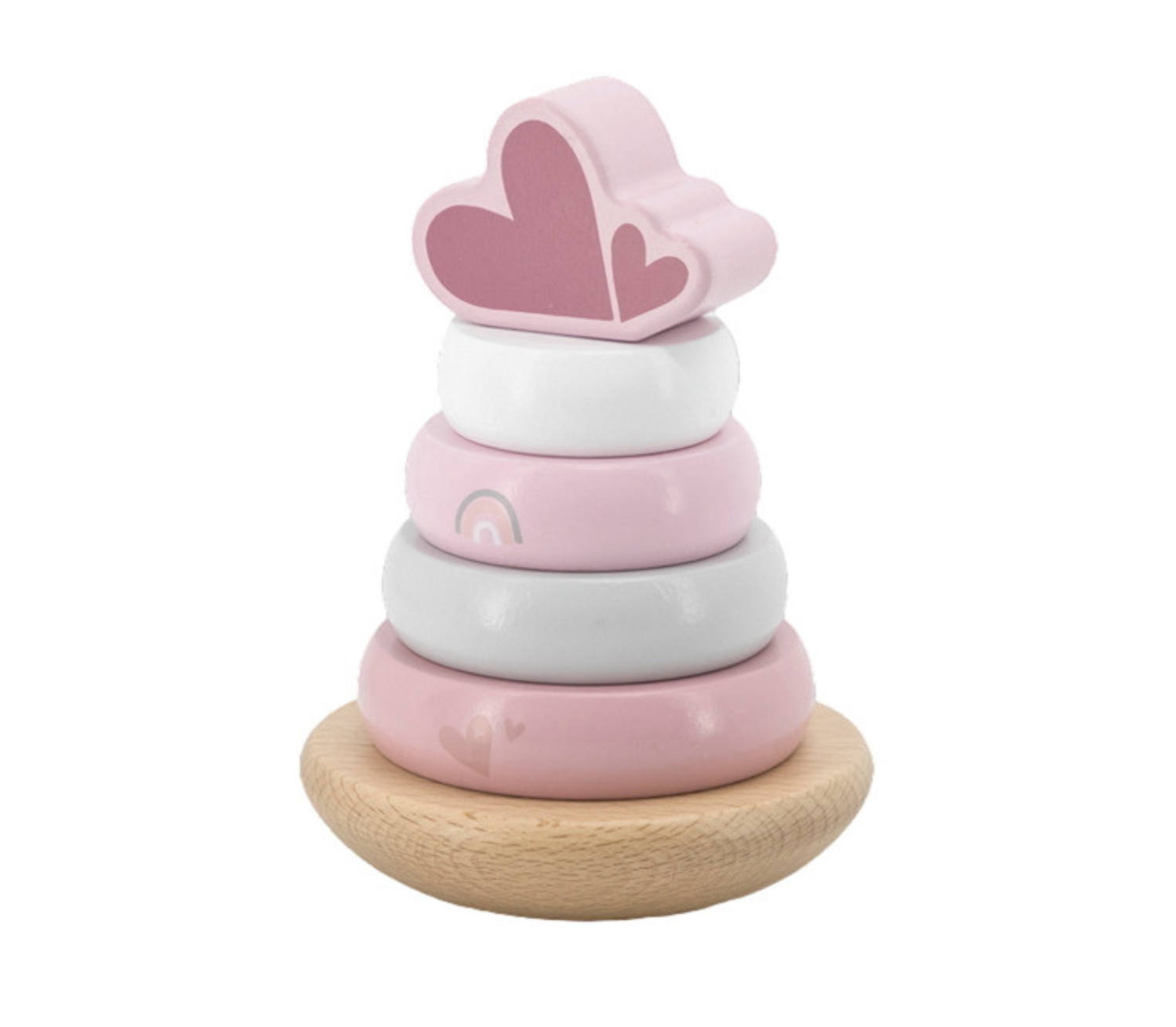 Wat zal jouw kleintje veel speelplezier beleven met deze houten tuimelringpiramide van Label Label! Deze stapelpiramide bestaat uit 6 verschillende onderdelen met zachte pastelkleurtjes. De hartjes bovenop maken het af!