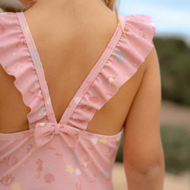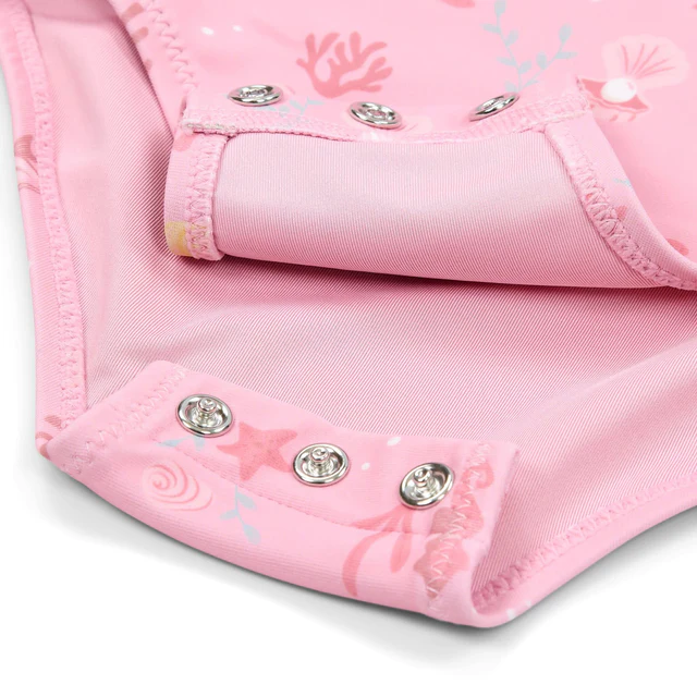 Laten we een verfrissende duik nemen! Of het nu in de golvende zee is, of in het heldere zwembadwater, met dit badpak maak je een spetterende indruk. Het Sunny Flowers-badpak heeft een zoete lichtroze kleur versierd met zeepaardjes, koraal en schelpen, waardoor een prachtig onderwaterthema ontstaat. De ruches op de schouderbandjes zorgen voor een speels en schattig uiterlijk. Het badpak is verkrijgbaar in vier maten. De twee kleinere maten, 62/68 en 74/80, hebben handige drukknoopjes in het kruis zodat je gemakkelijk een luier kunt verschonen. Combineer met de bijpassende zwem pet voor een Ocean Treasures look van top tot teen. Vergeet niet altijd zonnebrandcrème te gebruiken om je kleintje te beschermen.