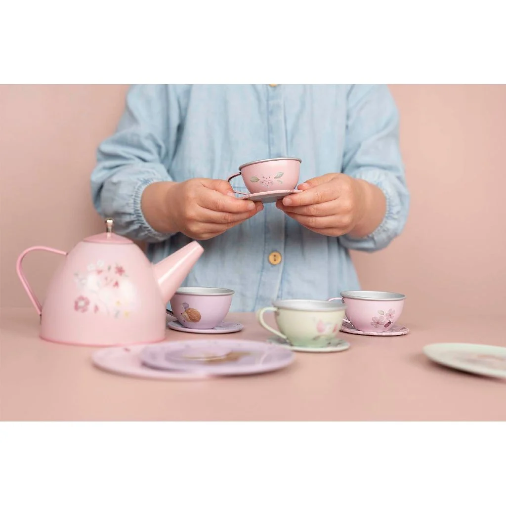 Zullen we samen theedrinken? Met dit schattige tinnen theeservies speelt je kind een geweldig rollenspel. Dit Fairy Garden theesetje prikkelt de fantasie van kinderen en stimuleert de fijne motoriek. De set bestaat uit vier kleine theekopjes, vier schoteltjes, vier gebaksbordjes en een theepot met deksel. Let op: berg het product na gebruik droog op. Wordt geleverd in windowbox. Geschikt voor kinderen vanaf 36 maanden.