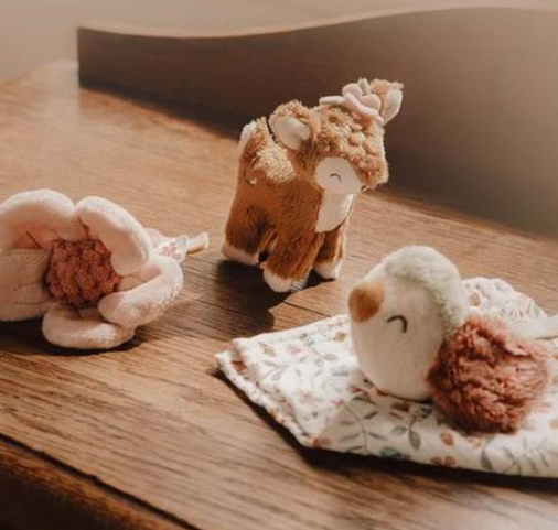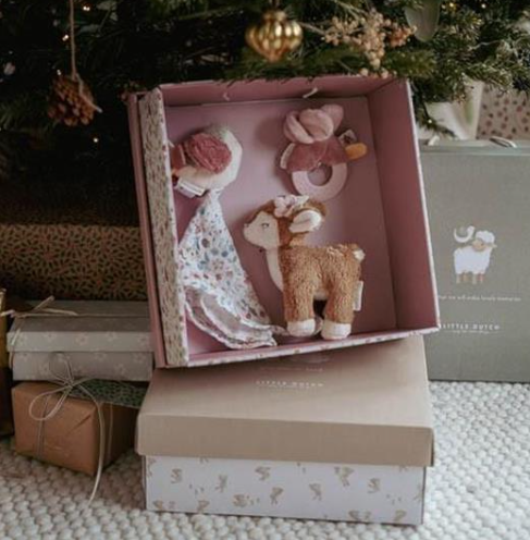 In de doos vind je een knuffeldoekje met een zacht vogeltje. Dit doekje is niet alleen heerlijk om mee te knuffelen, maar ook perfect voor een spelletje kiekeboe. Daarnaast bevat de set een knuffelhertje dat klaarstaat voor avonturen vol fantasie en stevige knuffels. Als derde item is er een bijtring toegevoegd, die verzacht wanneer de eerste tandjes doorkomen.