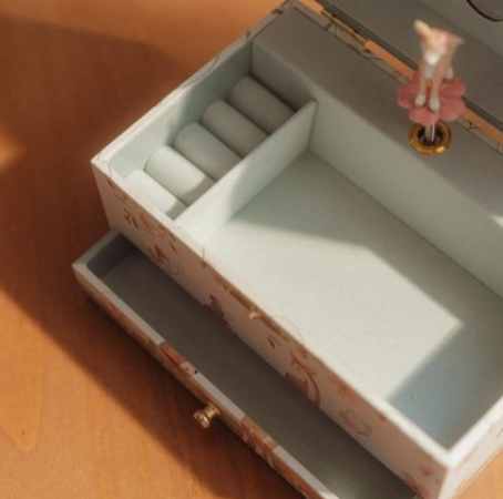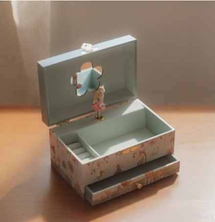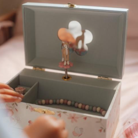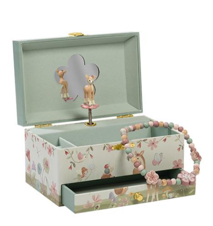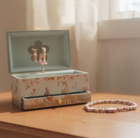 Zodra je het doosje opwindt en opent, begint er een klein feeëntje te dansen voor het spiegeltje, begeleid door een zacht en vrolijk muziekje. Dit magische moment maakt het juwelenkistje tot een blijvende herinnering die je kleintje jarenlang zal koesteren.