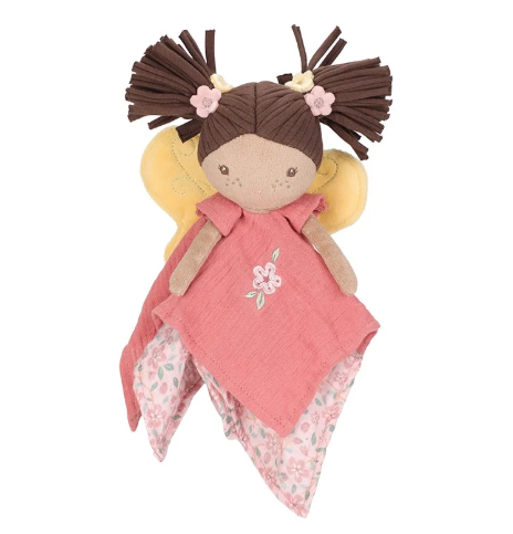 Laat je kleintje wegdromen in een wereld vol vrolijke bloemen met dit prachtige feeën knuffeldoekje. Haar zachte vleugels, geborduurde details, donkerbruine staartjes en oudroze jurkje maken haar perfect voor kleine handjes om vast te pakken en te knuffelen. Deze fee stimuleert de zintuigen en biedt comfort en geborgenheid. Ideaal voor dutjes of onderweg!