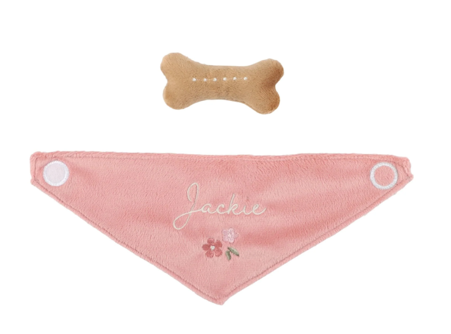 Neem je trouwe viervoeter overal mee naartoe met deze schattige knuffelhond Jackie in een gebloemde draagtas! Door de zachte stof en het lieve snoetje wordt dit al snel het favoriete knuffeldier van je kleintje. De tas heeft een handige uitsparing aan de voorkant, zodat het hondenkopje nieuwsgierig naar buiten kan kijken. Bij de set hoort ook een pluchen botje om heerlijk mee te spelen. Een droom voor elke kleine dierenliefhebber!