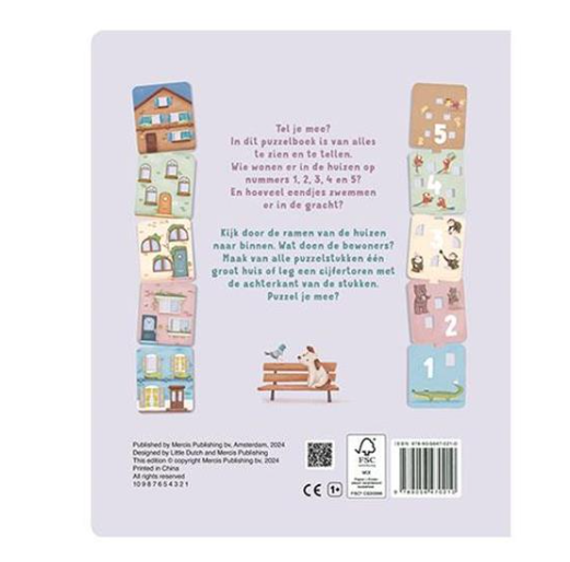 In dit puzzelboek is van alles te zien en te tellen. Wie wonen er in de huizen op nummers 1, 2, 3, 4 en 5? Hoeveel ramen tel je in elk huis? Tel eens hoeveel hondjes er aan het spelen zijn. De huizen staan steeds op een andere locatie: aan een haven, een gracht, een pleintje, een park en er is een huis met een grote tuin.