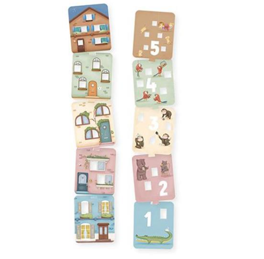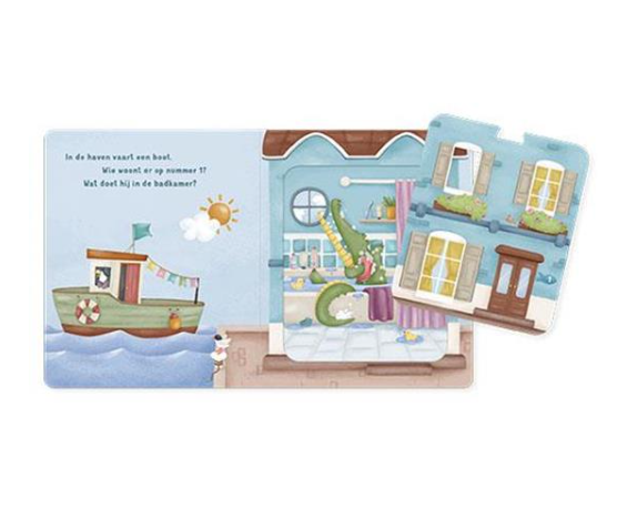 Er is niet alleen buiten van alles te zien. Kijk maar door de ramen van de huizen naar binnen. Wat doen de bewoners? De puzzelstukken zijn aan beide zijden bedrukt. Als je de puzzelstukken uit het boek haalt, kun je met alle stukken één groot huis maken. Of leg een cijfertoren met de achterkant van de stukken. Puzzel je mee?