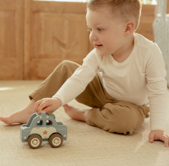 Dankzij de rubberen wielen rijdt deze politiewagen soepel en stil over elke speelvloer. Gemaakt van FSC-gecertificeerd hout en afgewerkt in zachte blauwe tinten, straalt het voertuig kwaliteit en charme uit. De herkenbare details zoals het politielicht en ster-embleem maken het spel extra levensecht.