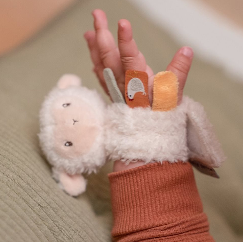 De Little Dutch polsrammelaar schaap Little Farm is een vrolijk en stimulerend speeltje voor baby’s vanaf de geboorte. Deze zachte armbandrammelaar bevestig je eenvoudig om de pols, zodat elke beweging wordt beloond met een zacht rammelend geluid. Het knuffelige schaapje en de verschillende labels nodigen uit tot voelen, grijpen en ontdekken. Ideaal om de zintuigen en motorische ontwikkeling van je baby te stimuleren.