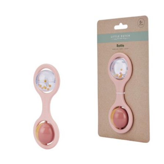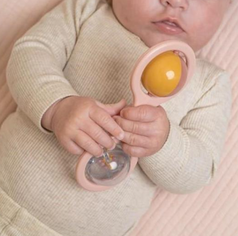 Het is tijd voor wat vrolijke geluidjes. In deze rammelaar zitten twee verschillende ballen. De transparante bal is gevuld met vrolijk gekleurde balletjes. De andere bal is voor de helft roze en voor de andere helft geel. Door aan deze bal te draaien zie je de meest mooie kleurencombinaties. De rammelaar heeft een handvat waardoor je kindje deze goed vast kan houden en er met veel plezier mee kan spelen.