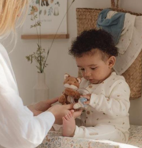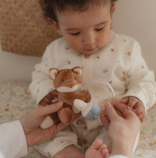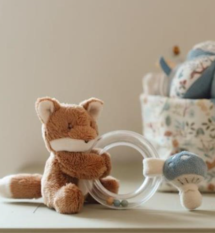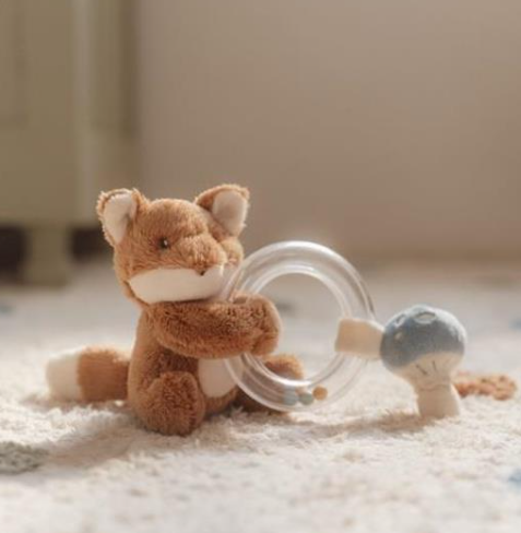 Grijp, draai en schud! Het lieve vosje met zijn zachte vacht en kleine staart nodigt je uit om te spelen en deze ringrammelaar te laten horen. De kleine paddenstoel heeft hij speciaal voor jou geplukt om mee te kroelen. De transparante ring is gevuld met 3 kleine kraaltjes die rammelen als je kindje ermee speelt. Dit aantrekkelijke babyspeeltje prikkelt niet alleen je baby’s zintuigen en nieuwsgierigheid, maar bevordert ook de hand-oogcoördinatie.