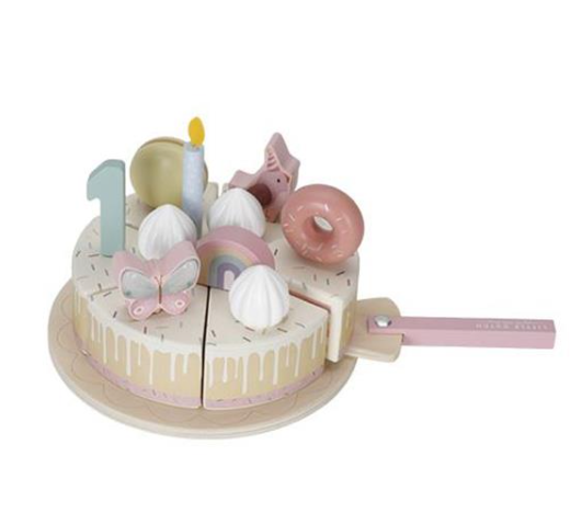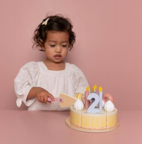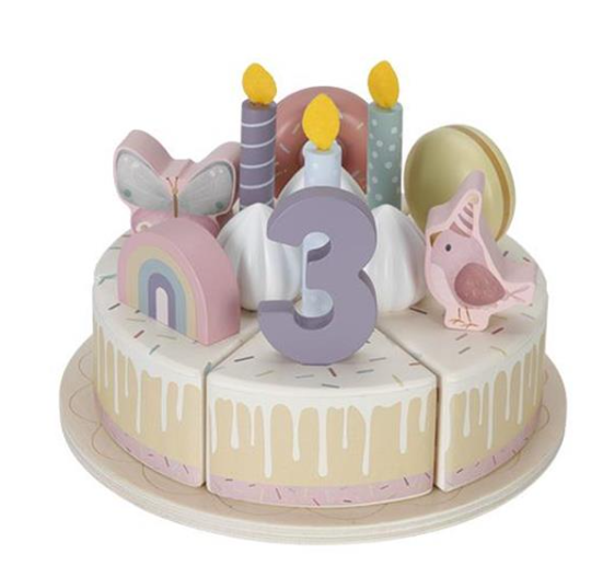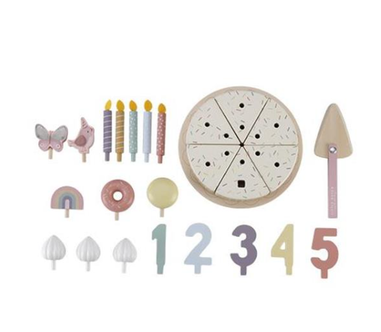 Een feestelijke houten taart waarmee kinderen hun eigen feestje kunnen spelen. De set bestaat uit zes taartstukken op een plateau, inclusief taartschep en allerlei versieringen: donut, macaron, vogel, vlinder, regenboog, kaarsjes, slagroomtoefjes en cijfer‑toppers 1 t/m 5. In totaal 26 onderdelen. De zachte pastelkleuren passen goed in moderne kinderkamers en speelhoeken.