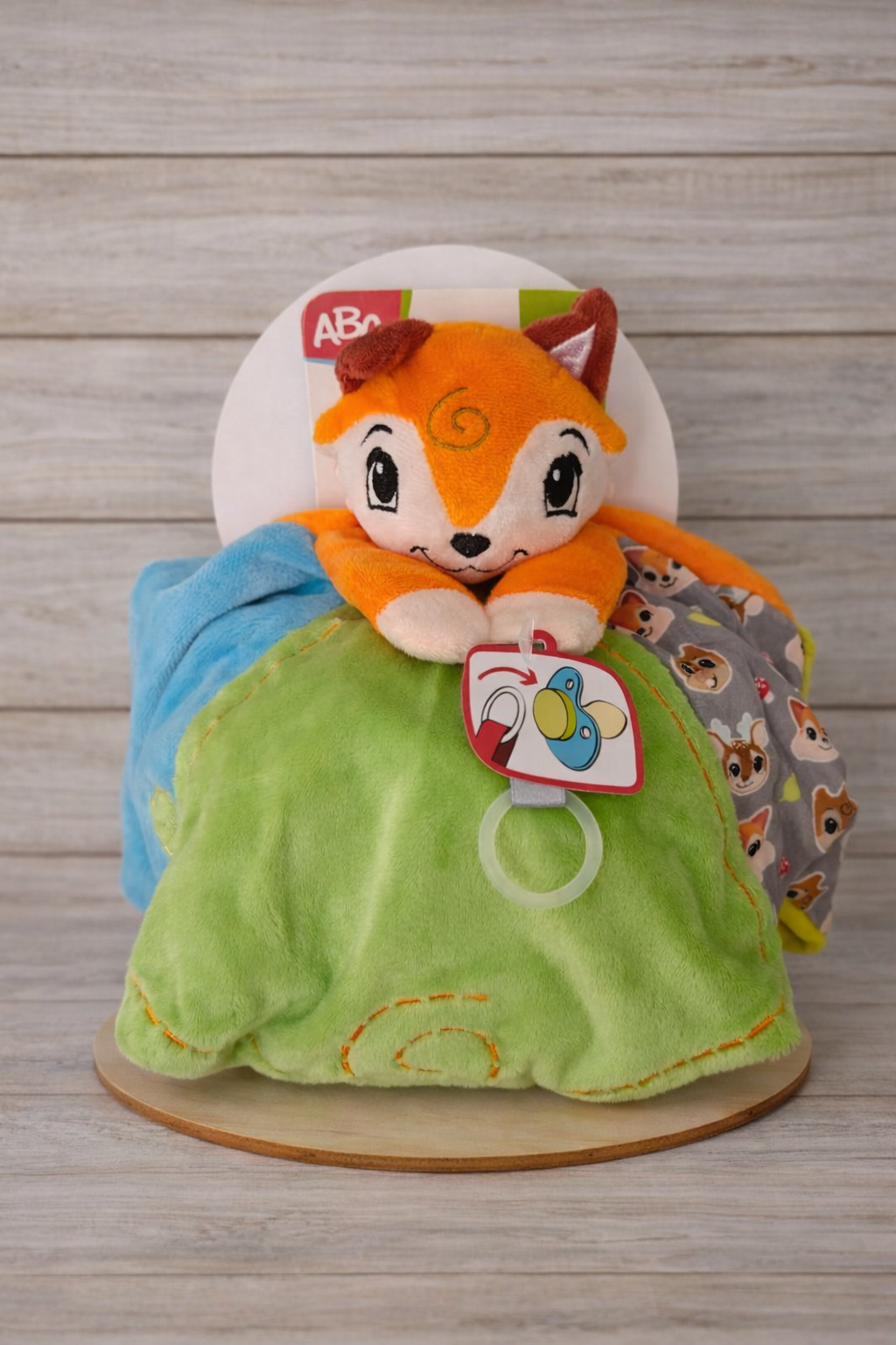 Dit luiertaartje Forest Friends is een stijlvol en vrolijk kraamcadeau voor de geboorte van een jongen. Op een stevig houten plateau liggen 8 zacht opgerolde luiers, zorgvuldig gestyled en afgewerkt met natuurlijke details. In het midden ligt een zacht knuffeldoekje uit de ABC Forest Friends‑collectie, ideaal voor troostmomentjes en om mee te knuffelen.