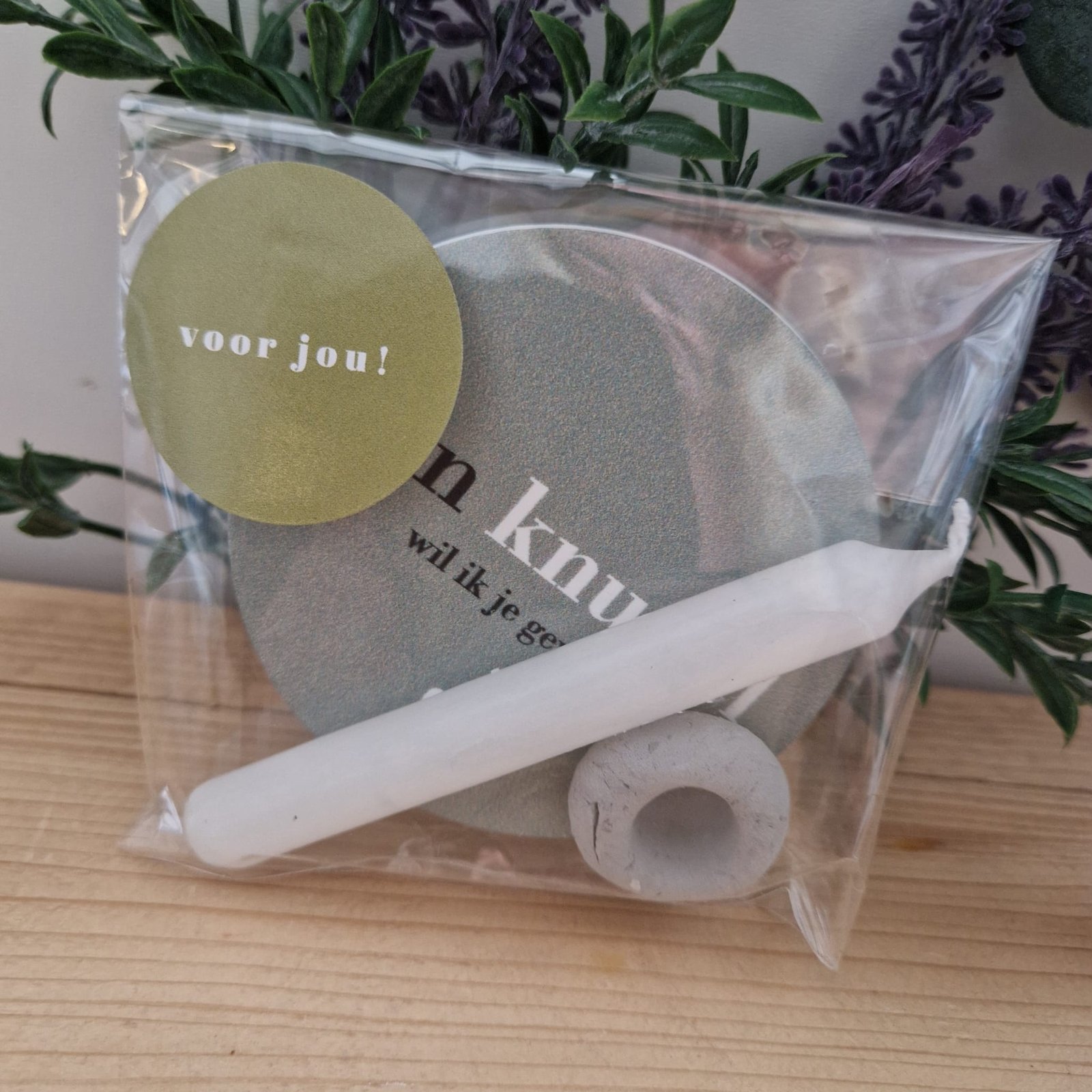 Alles wordt geleverd in een doorzichtig zakje, afgewerkt met een bijpassende sticker voor een feestelijke presentatie.