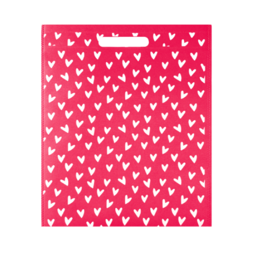 Non woven shopper / draagtas in het roze met opdruk hartjes. De tas is herbruikbaar en dagelijks toe te passen , bijvoorbeeld als boodschappentas. De tas is eenvoudig op te vouwen en te gebruiken als duurzame en milieuvriendelijke vervanger van plastic tassen.