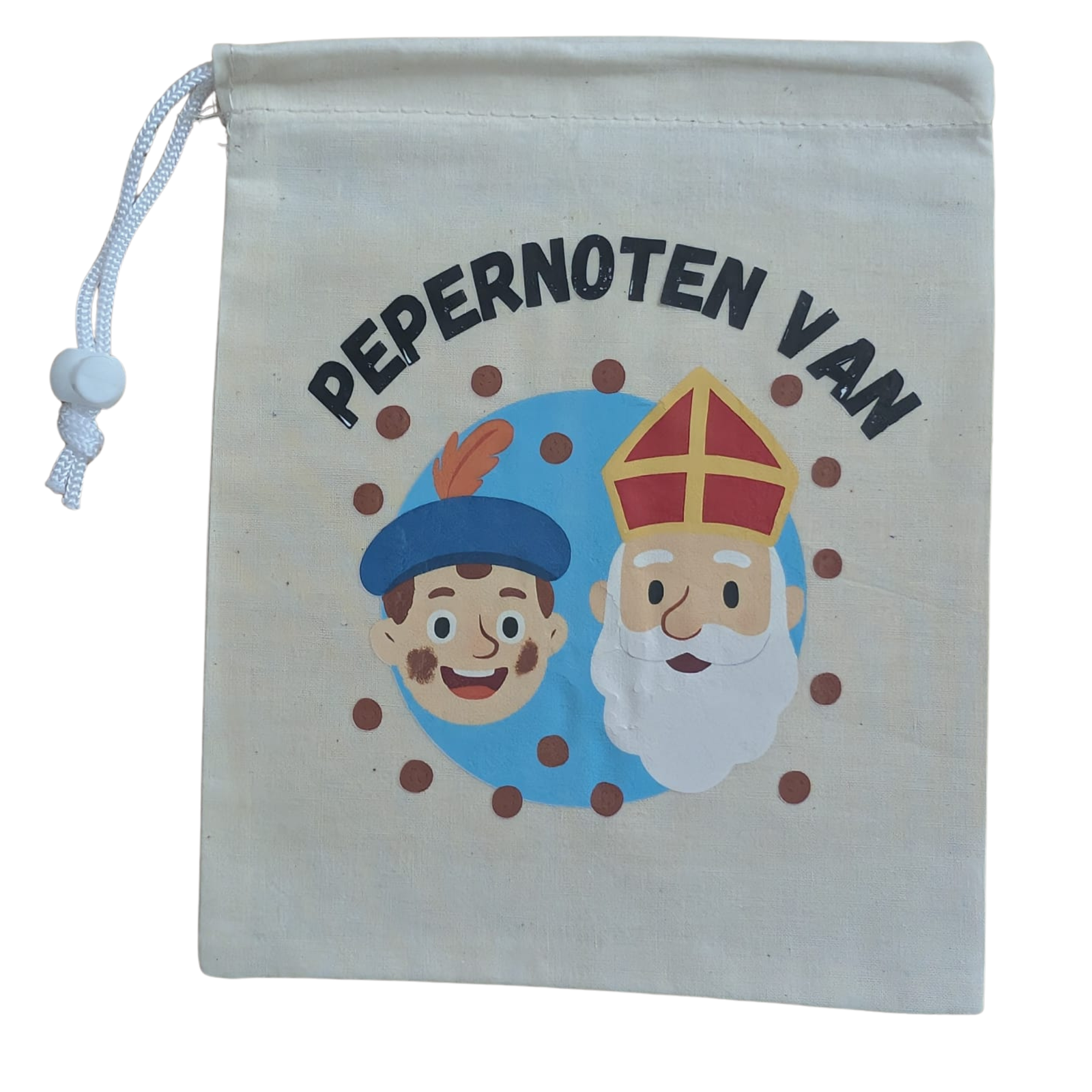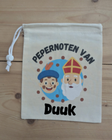 Vier Sinterklaas extra feestelijk met dit unieke pepernotenzakje! Het linnen zakje (22 x 18 cm) is bedrukt met een vrolijke Sinterklaas en Piet, samen met de tekst “Pepernoten van …”. Jij kiest de naam die erop komt, waardoor ieder zakje persoonlijk en speciaal wordt.