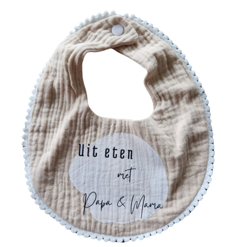 Deze schattige slab is perfect voor kleine eters! Gemaakt van zacht katoen, beschermt hij de kleertjes van je kleintje tijdens het eten. De slab is voorzien van de speelse tekst Uit eten met Papa en Mama