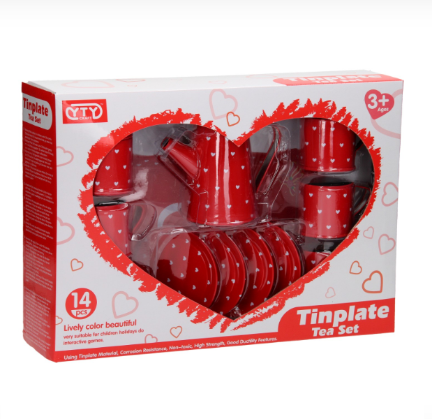 Dit schattige tinnen theeservies heeft een rode kleur en is bedrukt met witte hartjes. Het servies bestaat uit vier kopjes, vier schoteltjes, een theepot, een suiker- en melk potje en een dienblad. Met dit servies ben je helemaal klaar voor een gezellig theekransje met je vriendinnen!