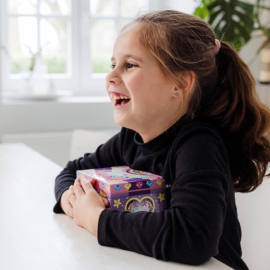 Open het sieradendoosje en ontdek een spiegeltje met een draaiende unicorn, die ronddraait terwijl een vrolijk muziekje speelt. Het opdraaibare mechanisme aan de achterkant maakt het doosje extra magisch en zorgt voor uren speelplezier. Kinderen kunnen hun favoriete sieraden overzichtelijk bewaren en tegelijkertijd genieten van het draaiende eenhoorntje en het deuntje.