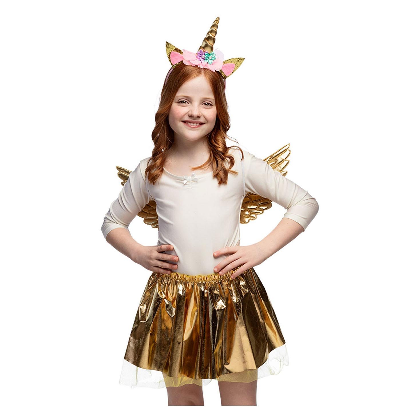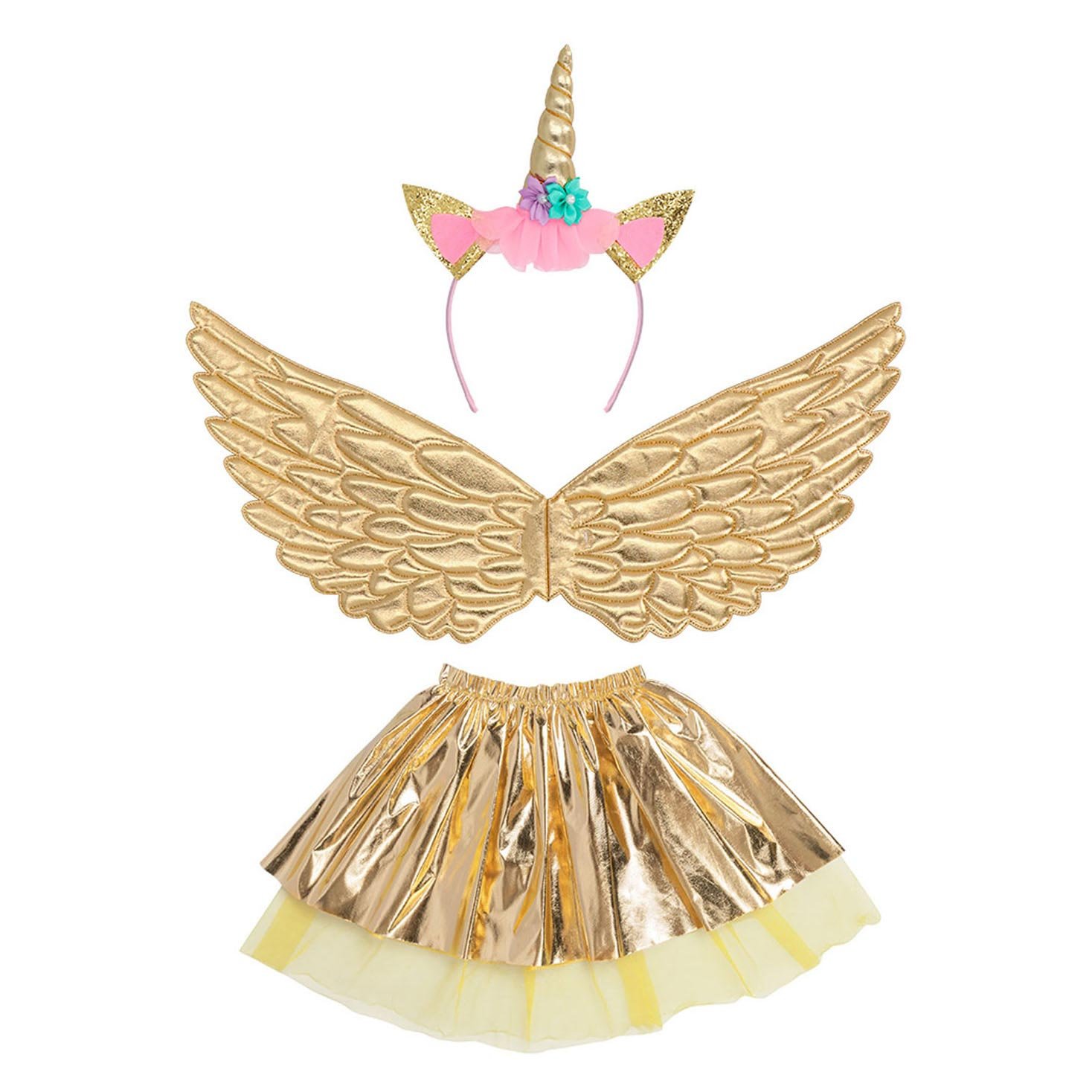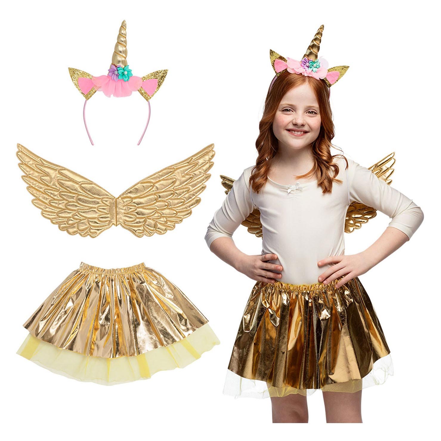 Voor alle kleine dromers en liefhebbers van magie is hier het ultieme verkleedkostuum: een schitterende gouden eenhoornfee! πŸŒˆπŸ¦„